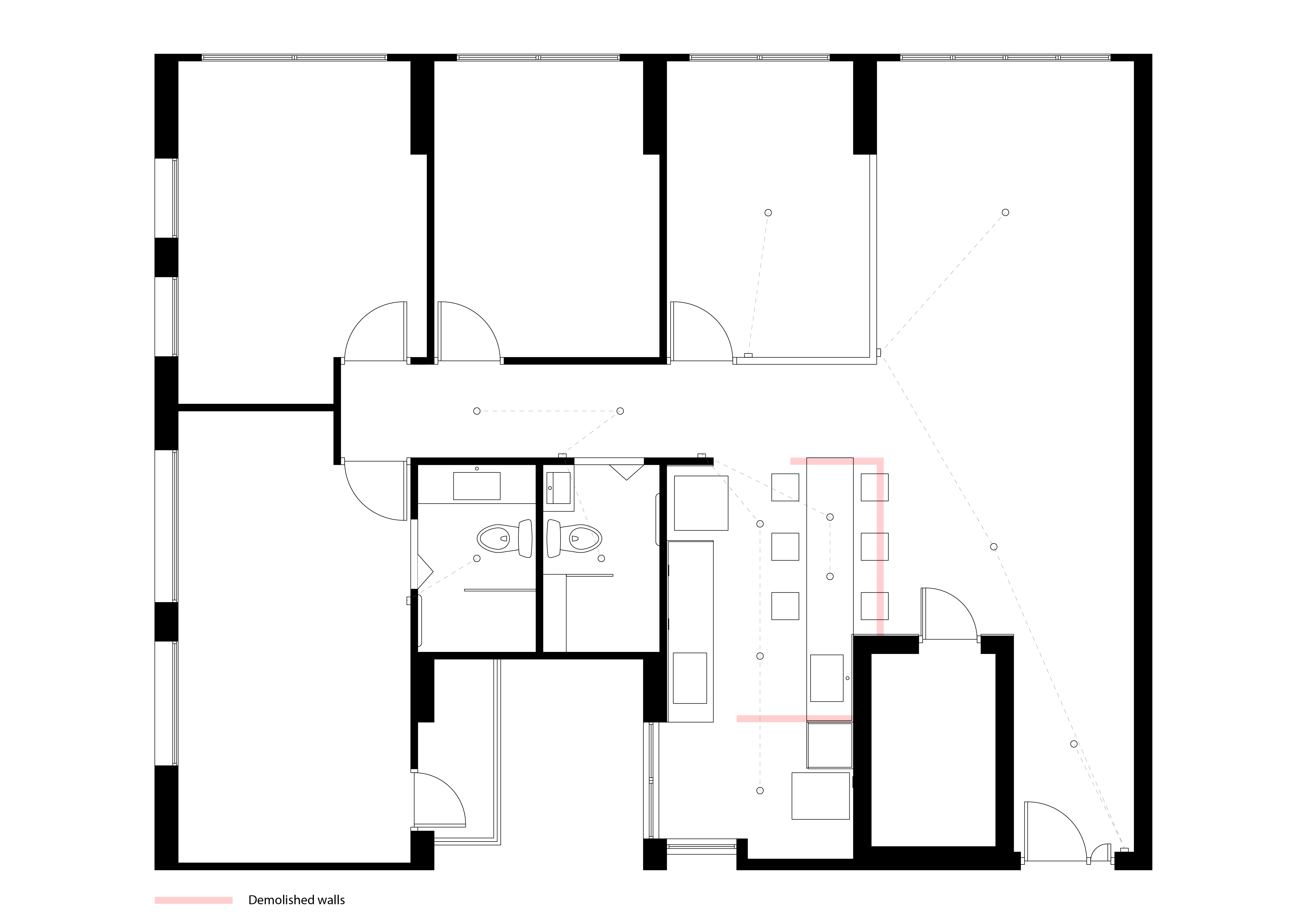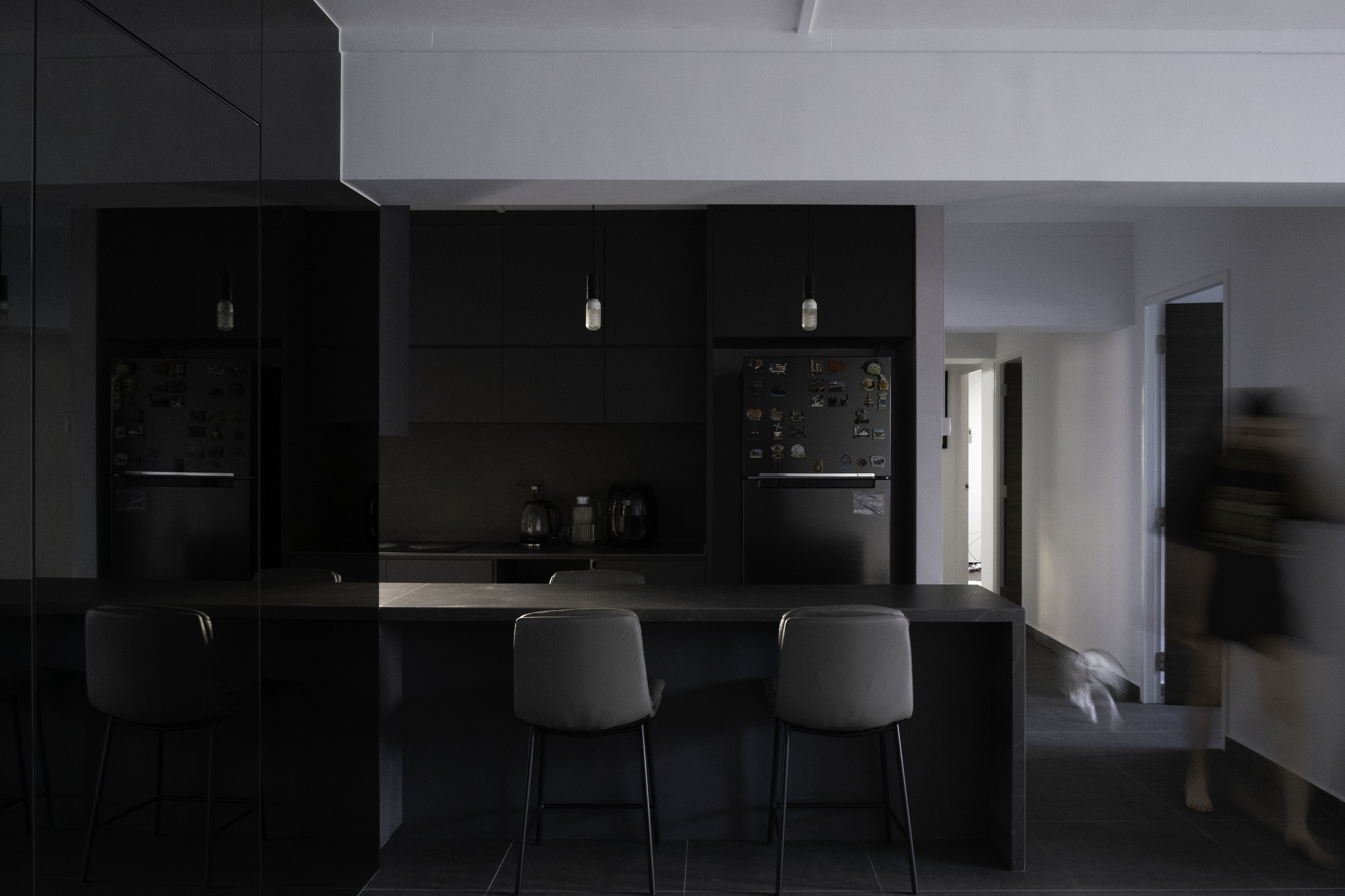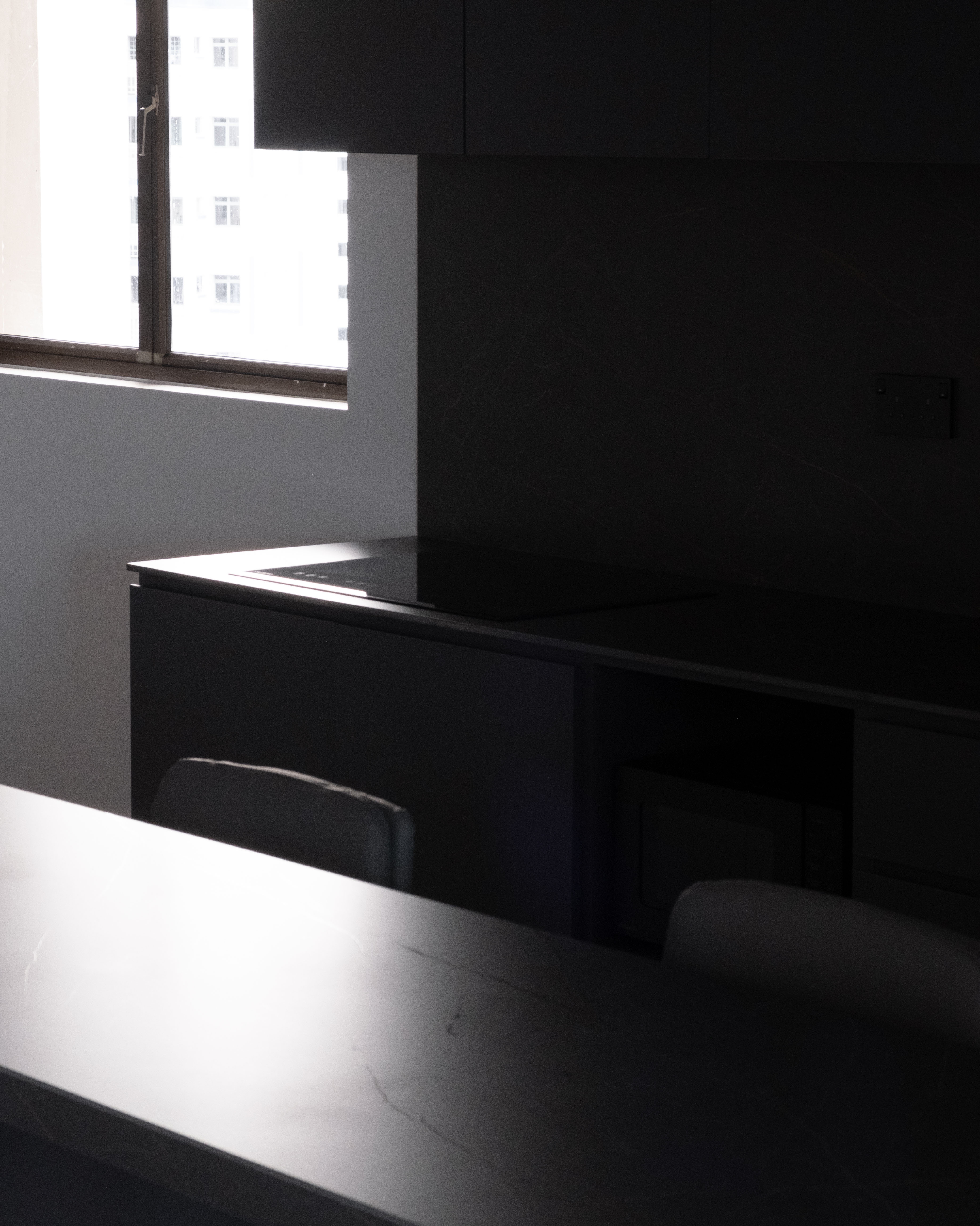 The 5-bedroom flat, originally defined by Venetian red marble tiles, herringbone timber flooring, and custard-coloured cabinetry, has been re-envisioned as a contemporary home. Retaining and restoring the herringbone became a deliberate gesture, grounding the transformation in the home’s material history. The new interior balances a quiet geometric play with thoughtful layering of timber and stone, creating a dialogue between texture and tone.